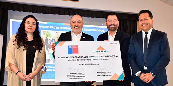 La Subsecretaría de Transportes y el Comité Regional de Seguridad Minera (Coresemin) suscribieron un convenio de colaboración para desarrollar iniciativas conjuntas que permitan prevenir siniestros en el tránsito y mejorar los estándares de seguridad vial en la región de Atacama.